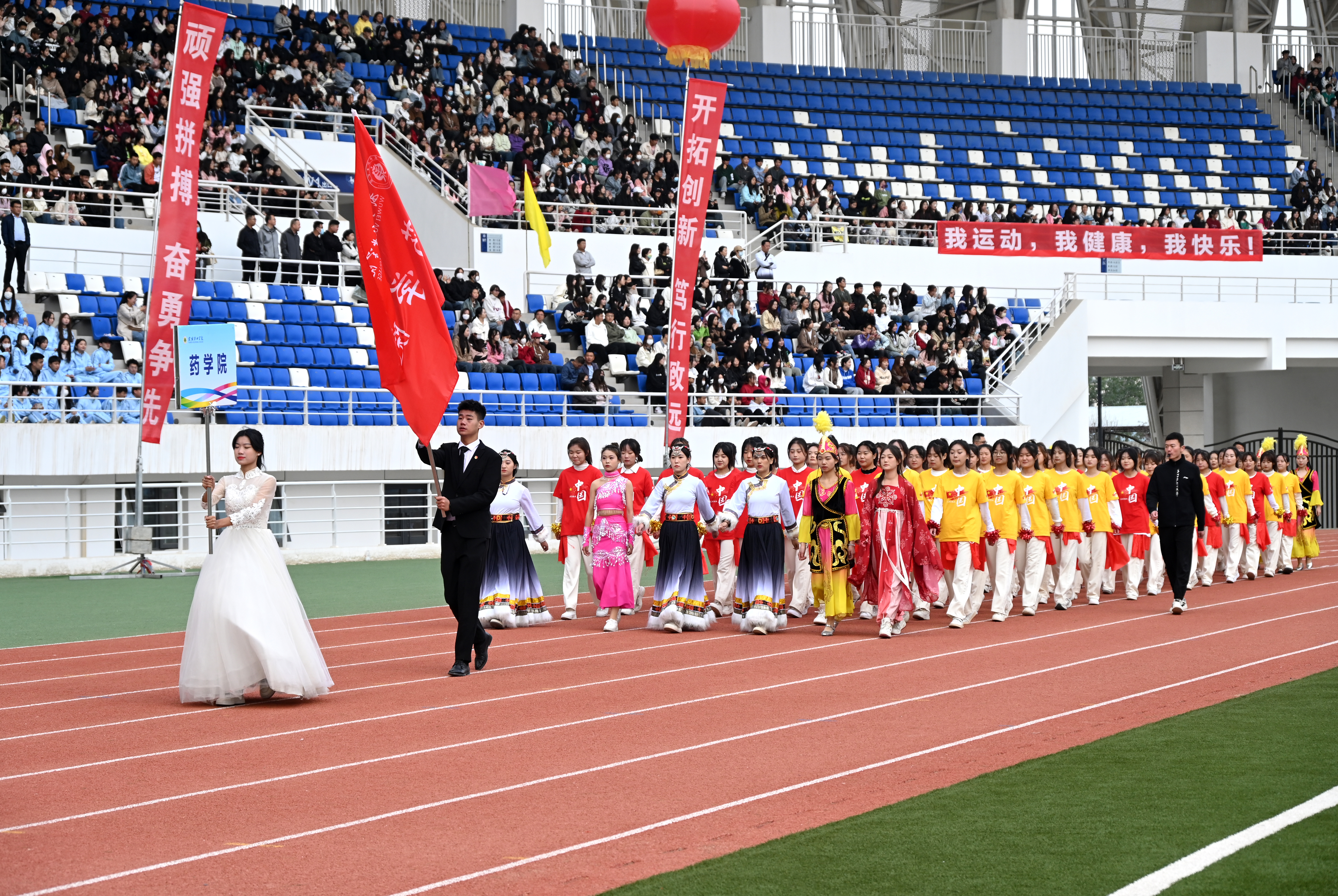 伴隨著雄壯激越的運動員進行曲,國旗護衛(wèi)隊、彩旗隊、裁判員隊伍、各二級學院方陣依次入場,隊列步伐整齊有力,口號堅定嘹亮,充分展示了師生良好的精神風貌。
