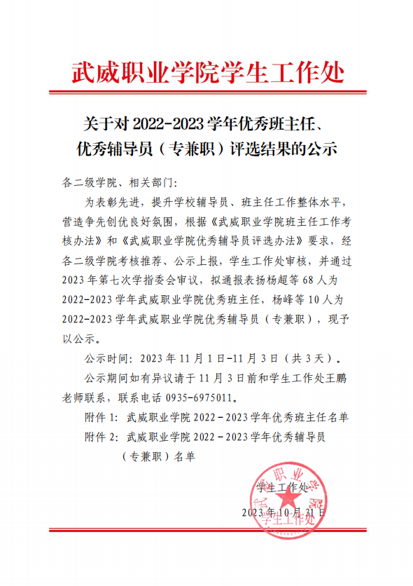 關(guān)于對2022-2023學年優(yōu)秀班主任、優(yōu)秀輔導員(專兼職)評選結(jié)果的公示