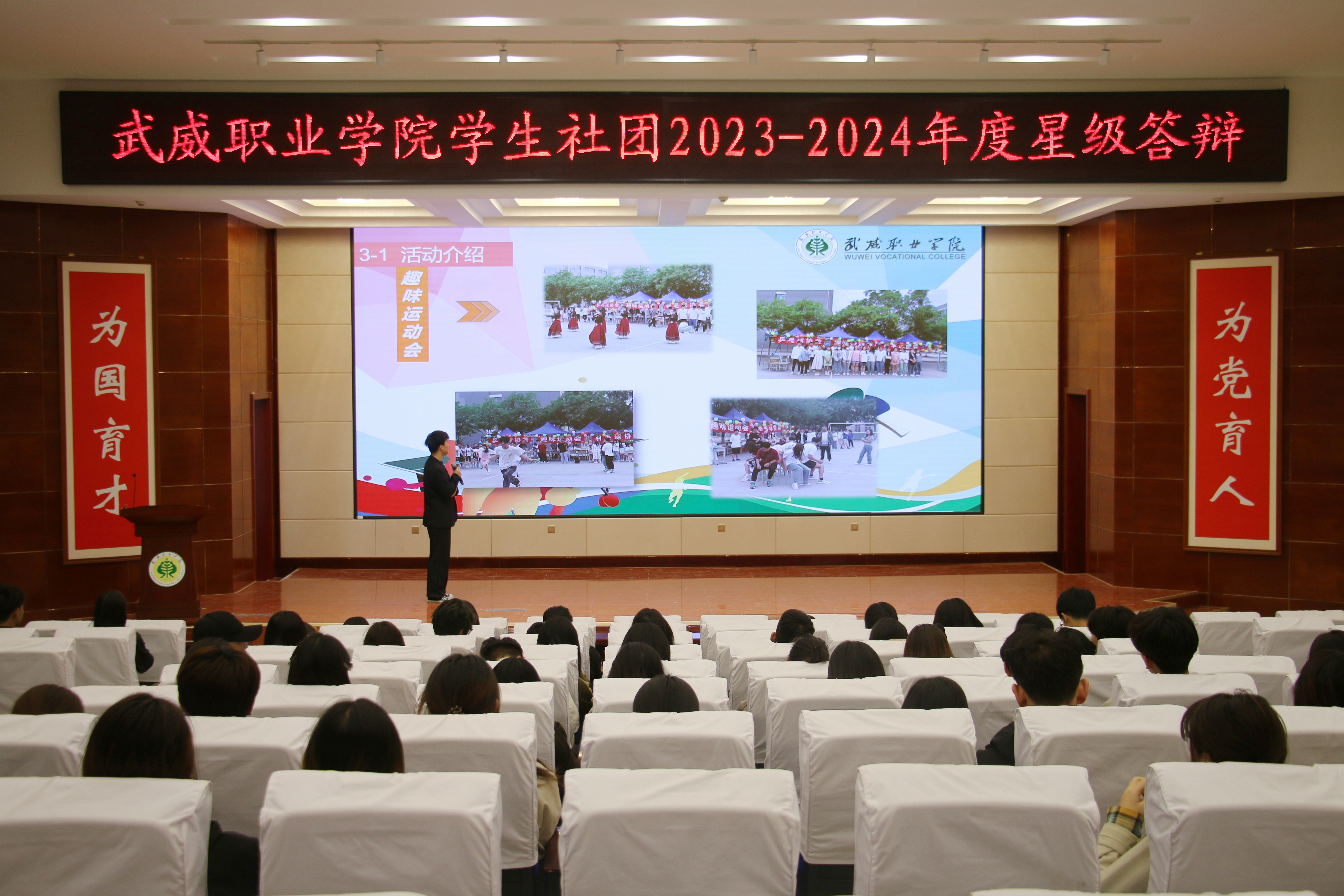 4月12日,學(xué)校在菁英廳舉辦了2023年度學(xué)生社團(tuán)星級答辯會。答辯現(xiàn)場,各學(xué)生社團(tuán)負(fù)責(zé)人通過PPT介紹了從基本情況、活動開展、品牌創(chuàng)新以及未來規(guī)劃等方面進(jìn)行答辯展示。其中,新思想學(xué)習(xí)社、大學(xué)生攻鼓子藝術(shù)團(tuán)等思想引領(lǐng)類社團(tuán)展示了文化沙龍、藝術(shù)展演等活動情況;藍(lán)天愛心協(xié)會、大學(xué)生就業(yè)創(chuàng)業(yè)促進(jìn)會等素質(zhì)拓展型社團(tuán)展示了愛心幫扶、就業(yè)創(chuàng)業(yè)等活動;青春健康同伴社、心翼心理協(xié)會等健康類社團(tuán)展示了健康防艾、心理咨詢等特色活動;朝陽武術(shù)協(xié)會、羽毛球協(xié)會、乒乓球協(xié)會等體育競技類社團(tuán)展示了促進(jìn)大學(xué)生健康和興趣培養(yǎng)方面的體育文化活動。最后,通過現(xiàn)場答辯、審核資料、社團(tuán)互評等方面綜合考量,評選出五星級學(xué)生社團(tuán)2個,四星級學(xué)生社團(tuán)4個,三星級社團(tuán)6個。