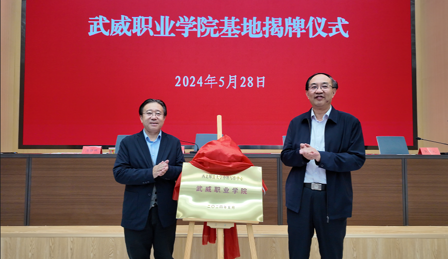 西北師范大學(xué)中外寫作中心常務(wù)副主任徐兆壽和武威職業(yè)學(xué)院黨委書記王宏為“西北師范大學(xué)中外寫作中心武威職業(yè)學(xué)院”基地揭牌。中國日報(bào)社甘肅記者站站長馬靜娜為基地贈送《中國日報(bào)》,武威職業(yè)學(xué)院黨委委員、副校長田迎春代表學(xué)校受贈。