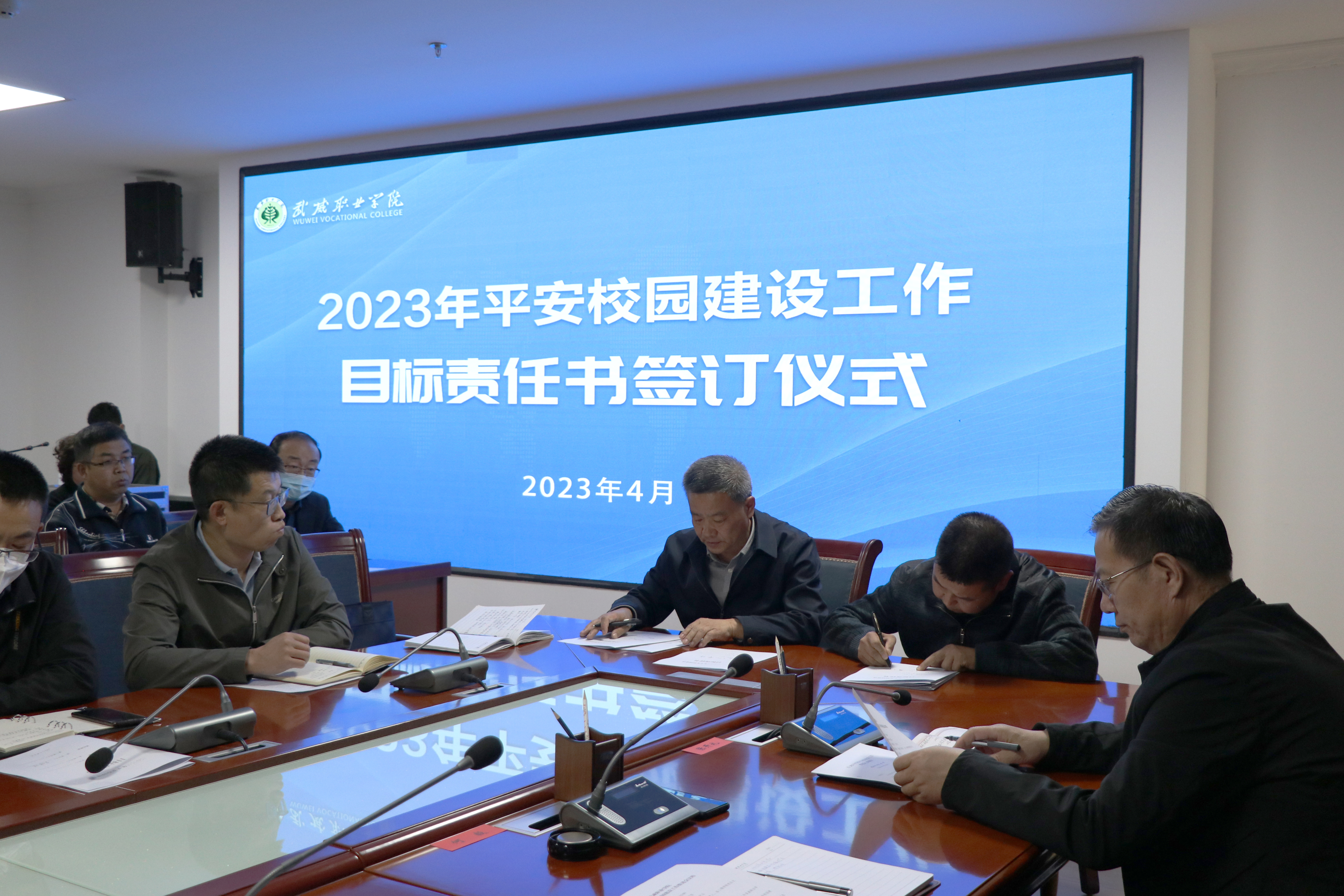 趙明與各部門、二級學(xué)院簽訂了2023年平安校園建設(shè)工作目標(biāo)責(zé)任書。王守云結(jié)合學(xué)校實際,對2023年平安校園建設(shè)工作作了安排。
