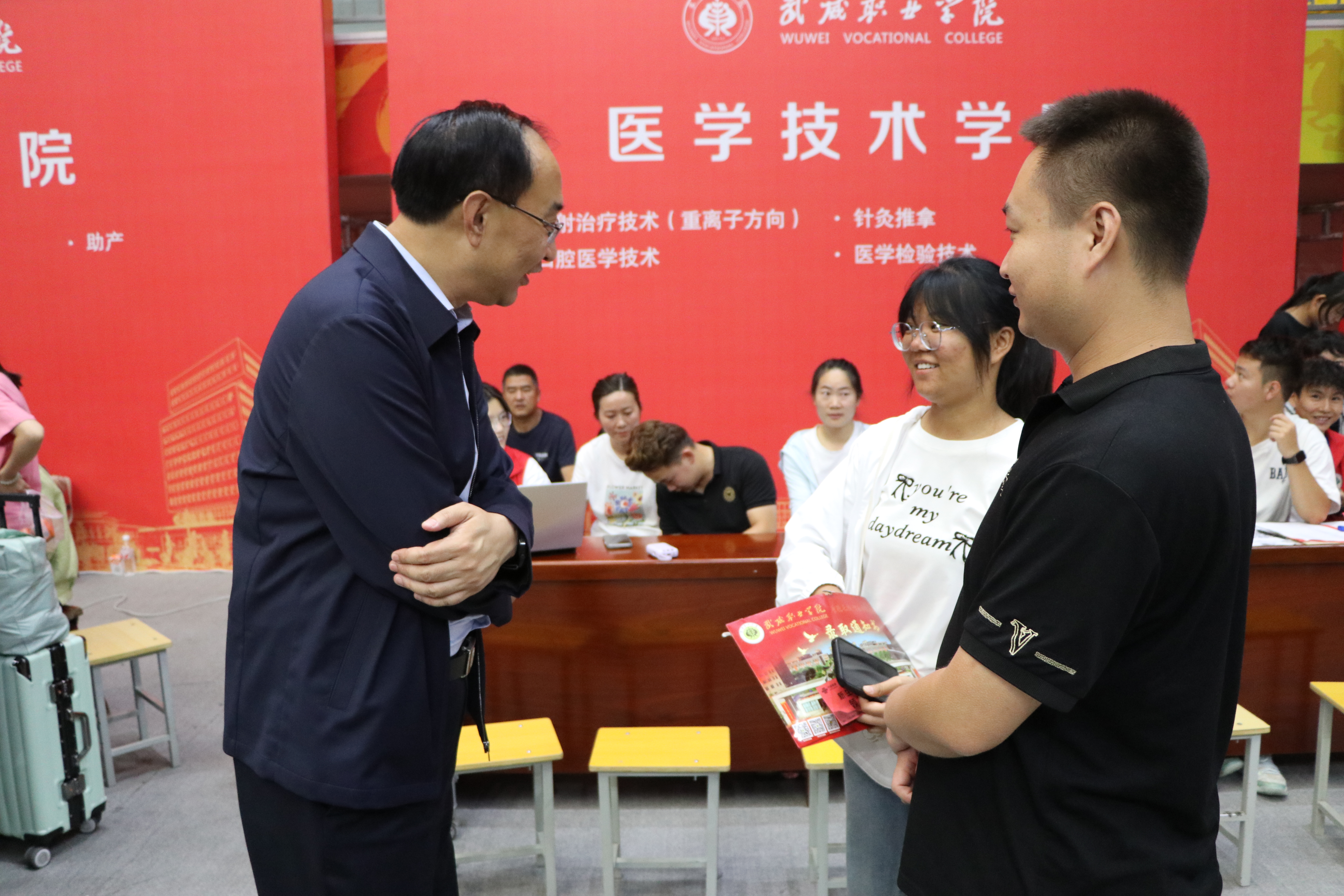 校領(lǐng)導(dǎo)一一走過(guò)新生報(bào)到處、綠色通道、繳費(fèi)處和各二級(jí)學(xué)院迎新報(bào)到點(diǎn),了解新生報(bào)到情況,仔細(xì)詢(xún)問(wèn)智慧學(xué)工平臺(tái)使用情況,親切問(wèn)候堅(jiān)守崗位的師生志愿者。在醫(yī)學(xué)技術(shù)學(xué)院報(bào)到點(diǎn)前,王宏與2024級(jí)放射治療技術(shù)(重離子方向)新生及家長(zhǎng)聊了起來(lái)——“歡迎你們來(lái)到武威職業(yè)學(xué)院學(xué)習(xí)!為什么會(huì)報(bào)考這個(gè)專(zhuān)業(yè)?”在得知學(xué)生家庭中有人從事重離子醫(yī)療領(lǐng)域的研發(fā)工作時(shí),王宏勉勵(lì)新生要努力學(xué)好專(zhuān)業(yè)、練好技能,爭(zhēng)做高素質(zhì)技術(shù)技能人才。在家長(zhǎng)休息區(qū),王宏與來(lái)自甘肅慶陽(yáng)的新生家長(zhǎng)親切交談,并介紹了學(xué)校的辦學(xué)情況,建議學(xué)生和家長(zhǎng)在校園里走一走看一看,多了解熟悉學(xué)校,幫助學(xué)生盡快適應(yīng)大學(xué)生活,并祝愿學(xué)生家長(zhǎng)在武期間,一切順利。