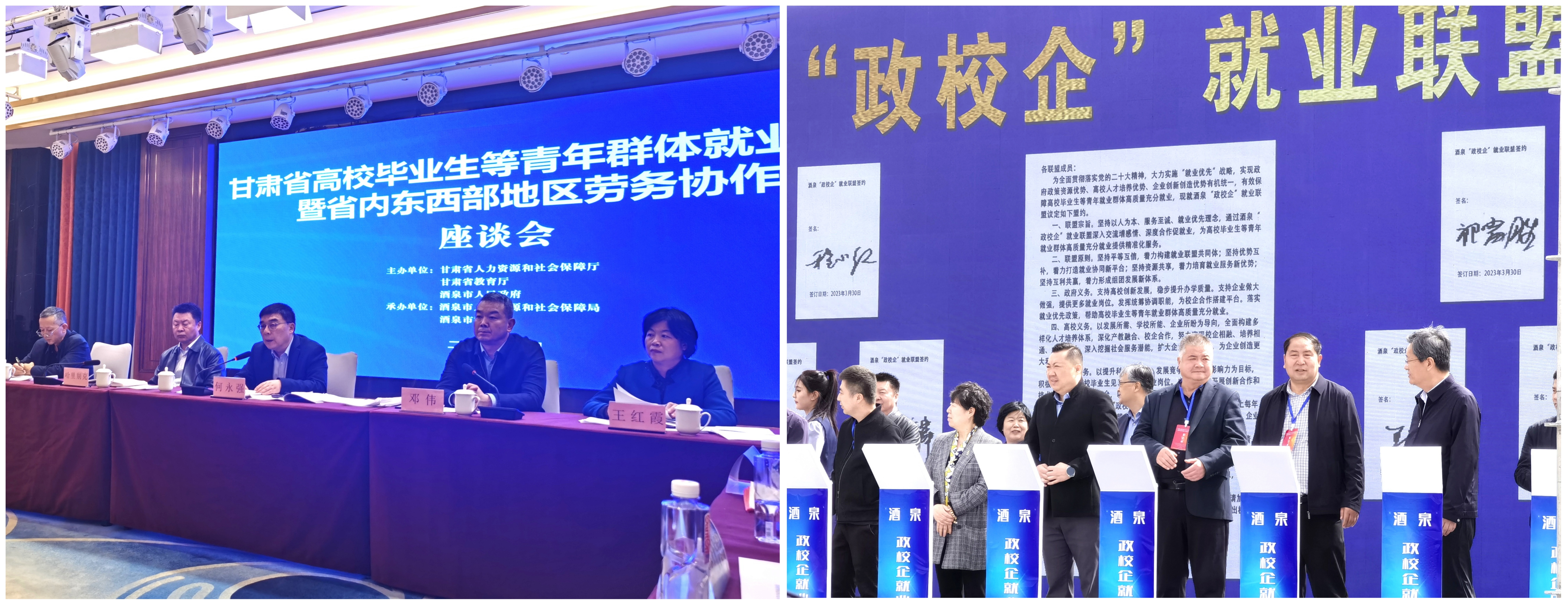 3月30日,王守云帶領(lǐng)招生就業(yè)處、合作教育辦負(fù)責(zé)人董鵬,在酒泉市參加了由甘肅省人社廳、教育廳組織舉辦的“甘肅省高校畢業(yè)生等青年群體就業(yè)暨省內(nèi)東西部地區(qū)勞務(wù)協(xié)作”座談會(huì)與招聘會(huì),并進(jìn)行了政校企就業(yè)聯(lián)盟簽約活動(dòng)。王守云代表武威職業(yè)學(xué)院在會(huì)上做了題為“政校企聯(lián)動(dòng)深化校企合作,促進(jìn)畢業(yè)生高質(zhì)量充分就業(yè)”的交流發(fā)言。