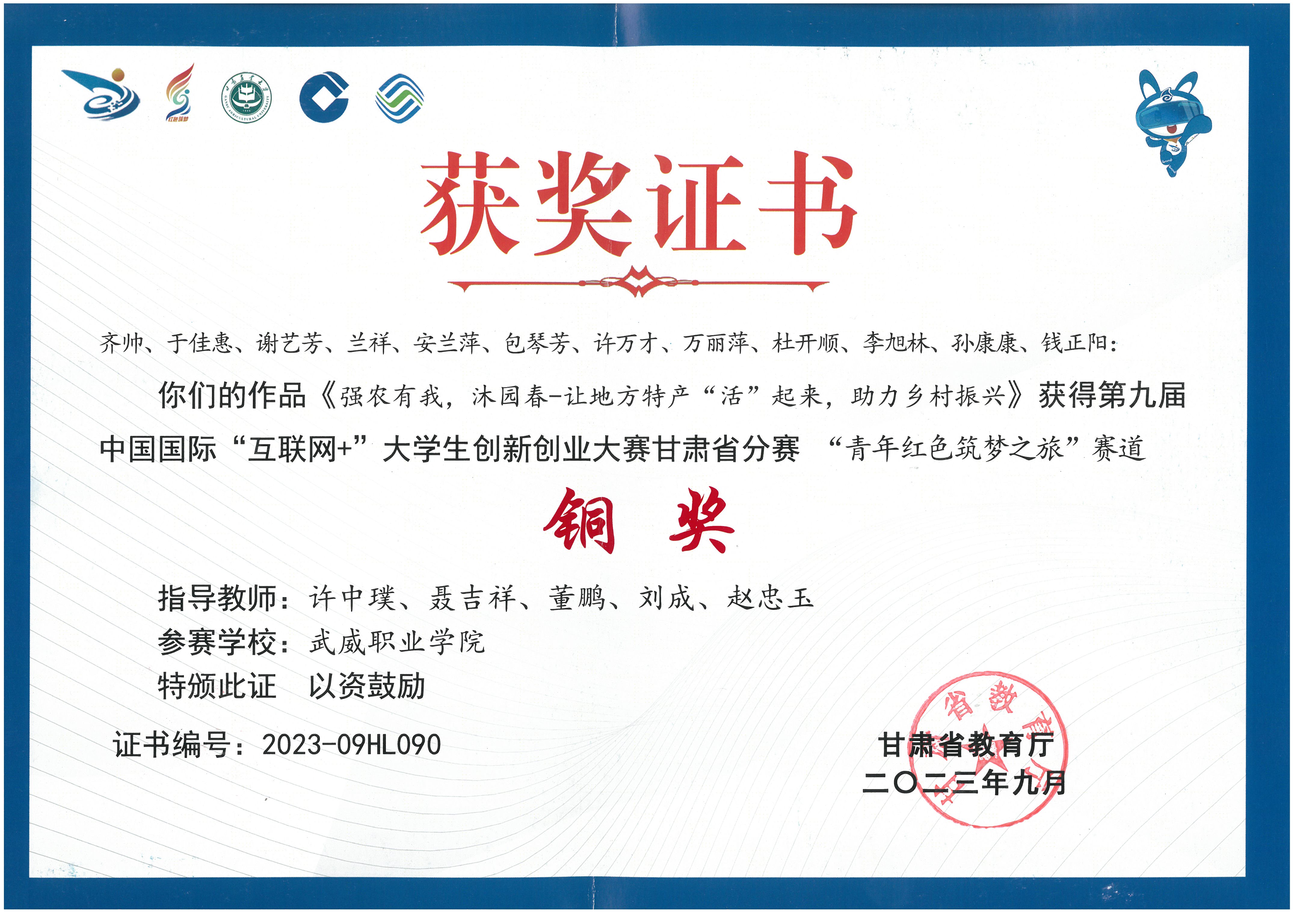 第九屆中國國際“互聯(lián)網(wǎng)+”大學(xué)生創(chuàng)新創(chuàng)業(yè)大賽甘肅省賽區(qū)銅獎