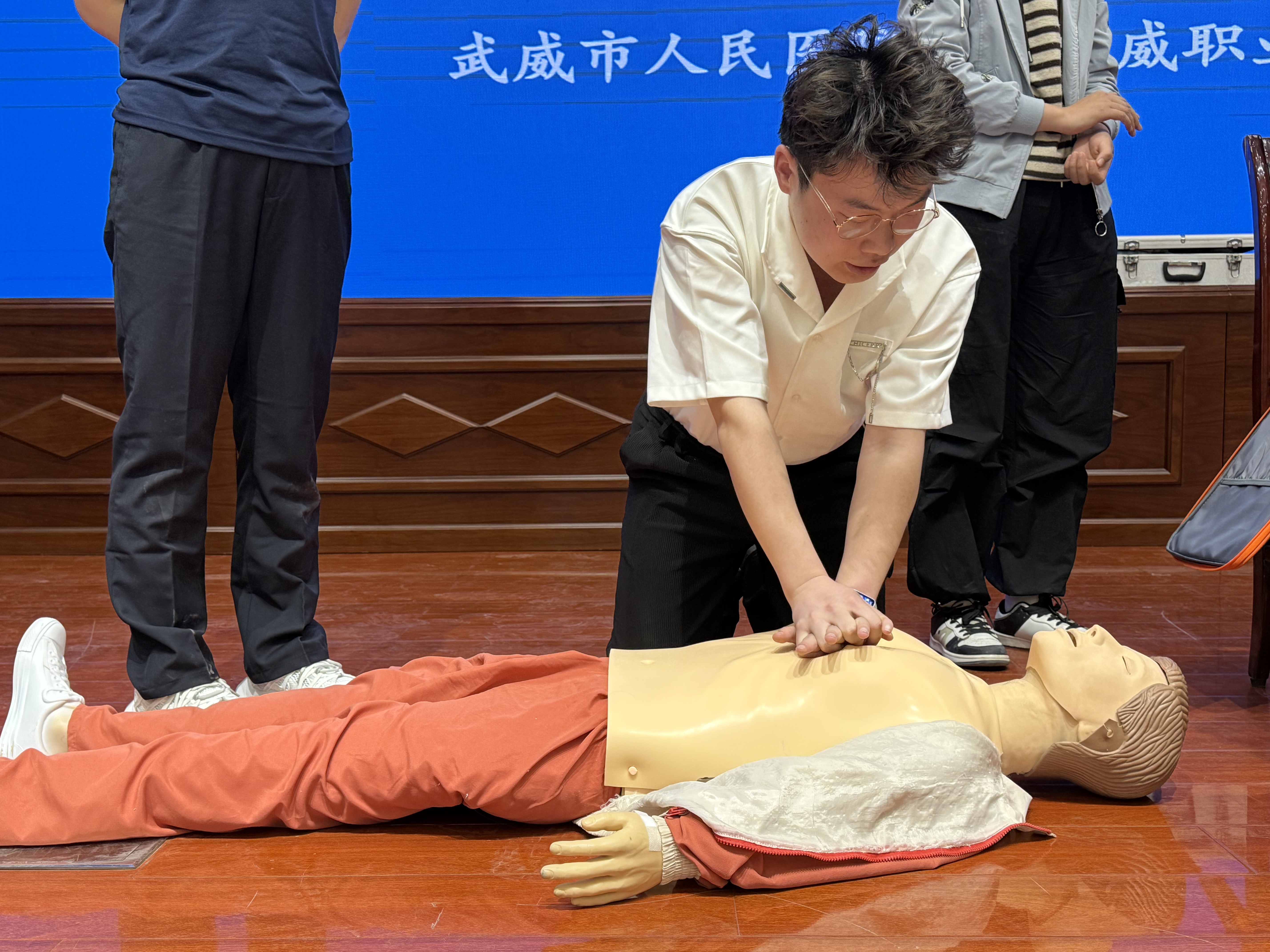 在理論環(huán)節(jié),武威市人民醫(yī)院急診科劉主任圍繞現(xiàn)代救護理念展開講解,重點強調(diào)“黃金4分鐘”在心肺復蘇中的關鍵作用,并詳細解讀心肺復蘇(CPR)操作流程、AED使用規(guī)范、海姆立克急救法及創(chuàng)傷救護技術。結(jié)合真實案例,劉主任糾正了“掐人中急救”“盲目搬動傷者”等常見誤區(qū),通過視頻演示和互動問答,幫助同學們掌握科學施救要點。“急救是每個公民的社會責任,關鍵時刻能挽救生命?!眲⒅魅蔚闹v解深入淺出,現(xiàn)場學生認真記錄,積極提問。?