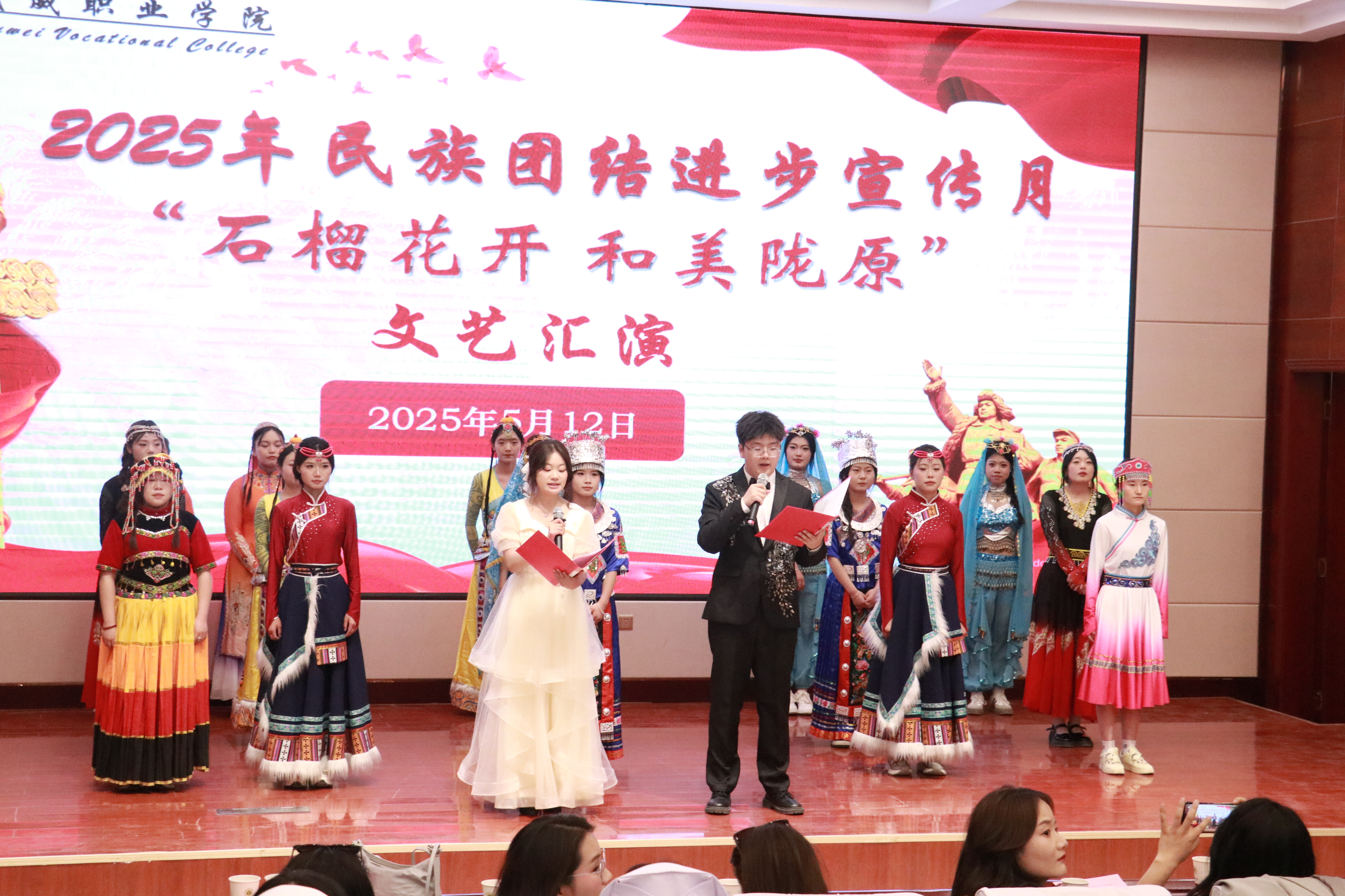 為深入貫徹落實(shí)黨的二十大精神,深化民族團(tuán)結(jié)進(jìn)步教育,鑄牢中華民族共同體意識(shí),5月12日,護(hù)理學(xué)院在學(xué)校菁英廳舉行2025年民族團(tuán)結(jié)進(jìn)步宣傳月“石榴花開(kāi),和美隴原”主題文藝匯演。學(xué)院黨總支書(shū)記黃文源、全體教職工和學(xué)生代表共200余人參加。