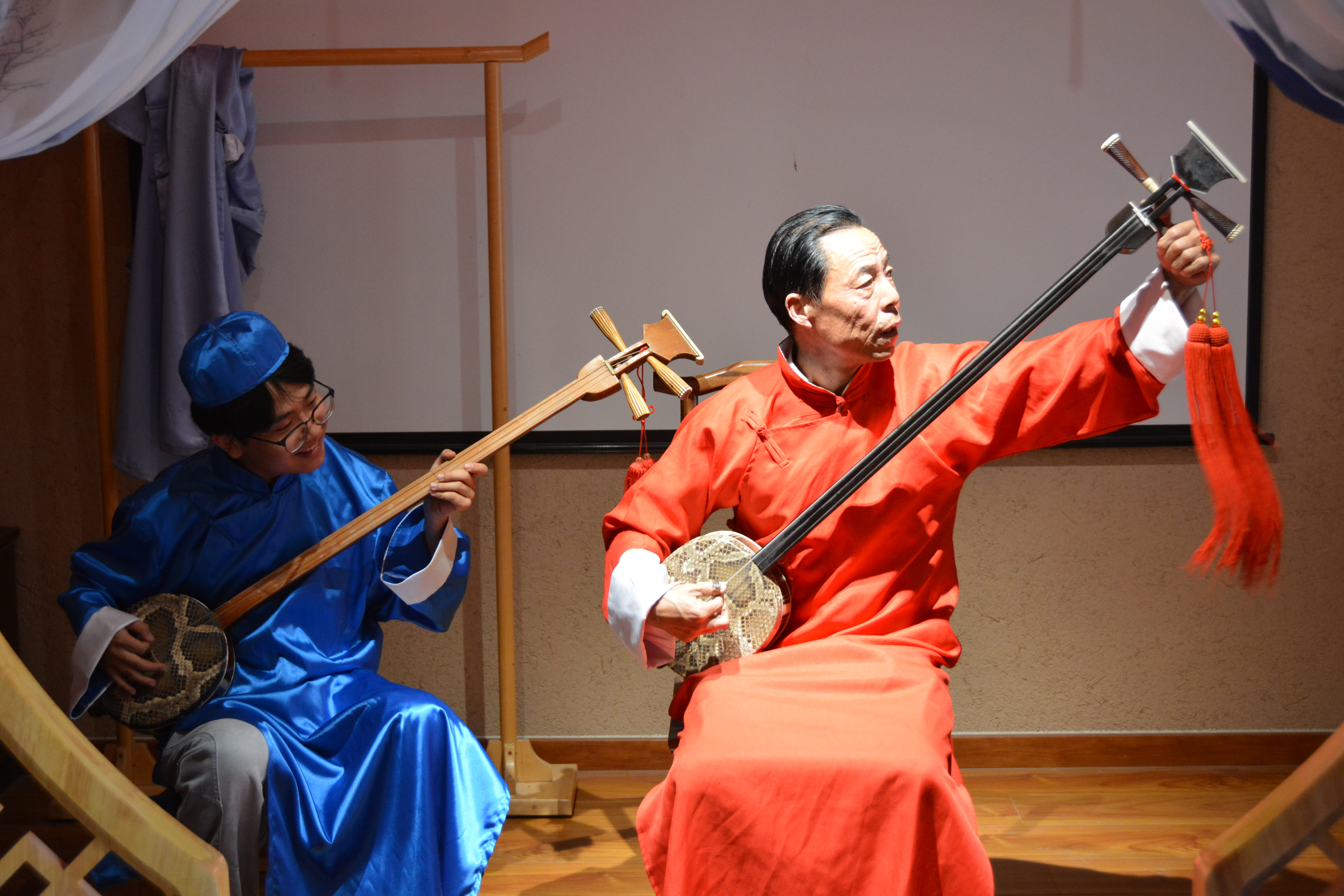 非遺民俗文化館當(dāng)天化身成為一座流動(dòng)的非遺課堂,實(shí)踐團(tuán)成員們圍坐在古樸的庭院中,聚精會(huì)神地聆聽當(dāng)?shù)刭Y深賢孝藝人董永虎老師深情演繹的經(jīng)典曲目。老藝人蒼勁而富有穿透力的嗓音,伴著三弦琴弦的顫動(dòng),將一段段蘊(yùn)含忠孝節(jié)義、勸人向善的古老故事娓娓道來。那飽經(jīng)歲月洗禮的曲調(diào),仿佛穿越時(shí)空,在青磚黛瓦間回蕩,讓在場的每一位學(xué)子都深深沉浸其中,體味著這門古老說唱藝術(shù)所承載的歷史重量與人文溫度。