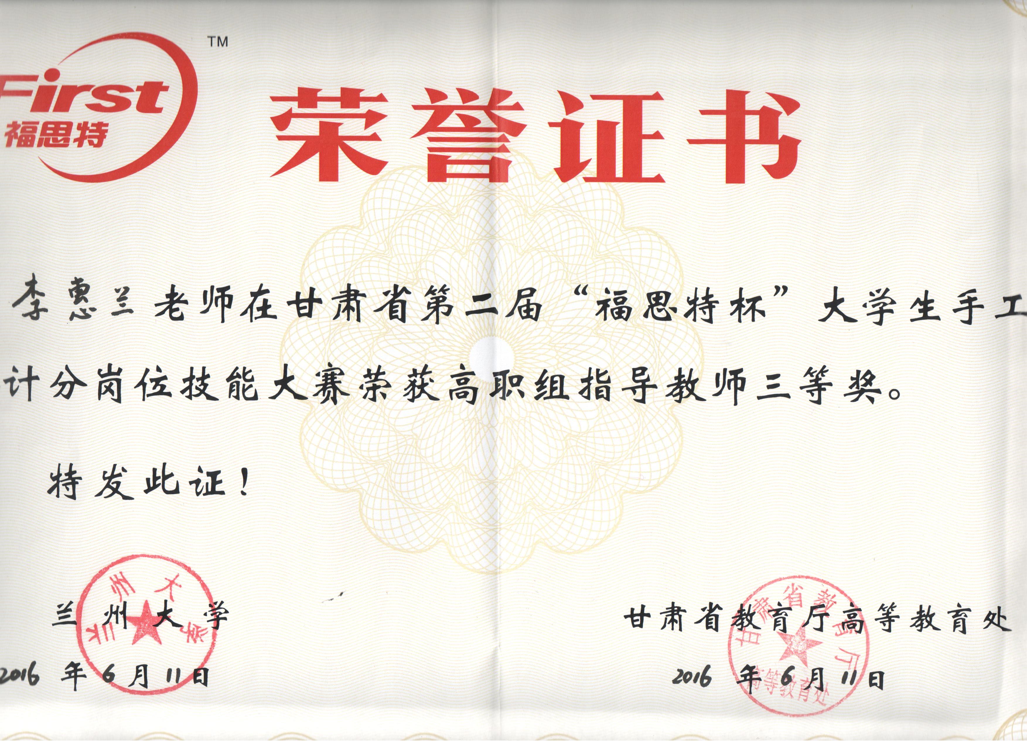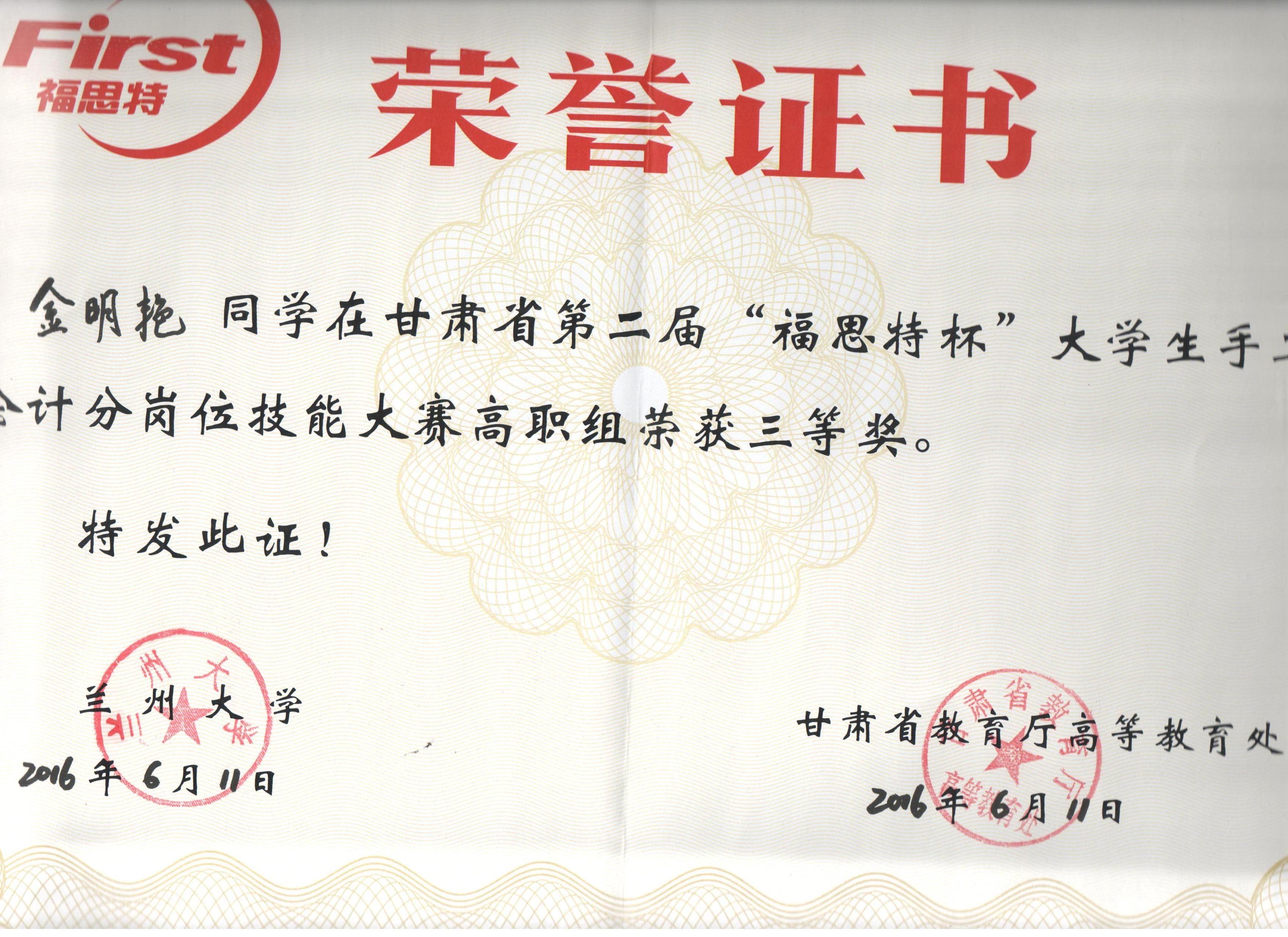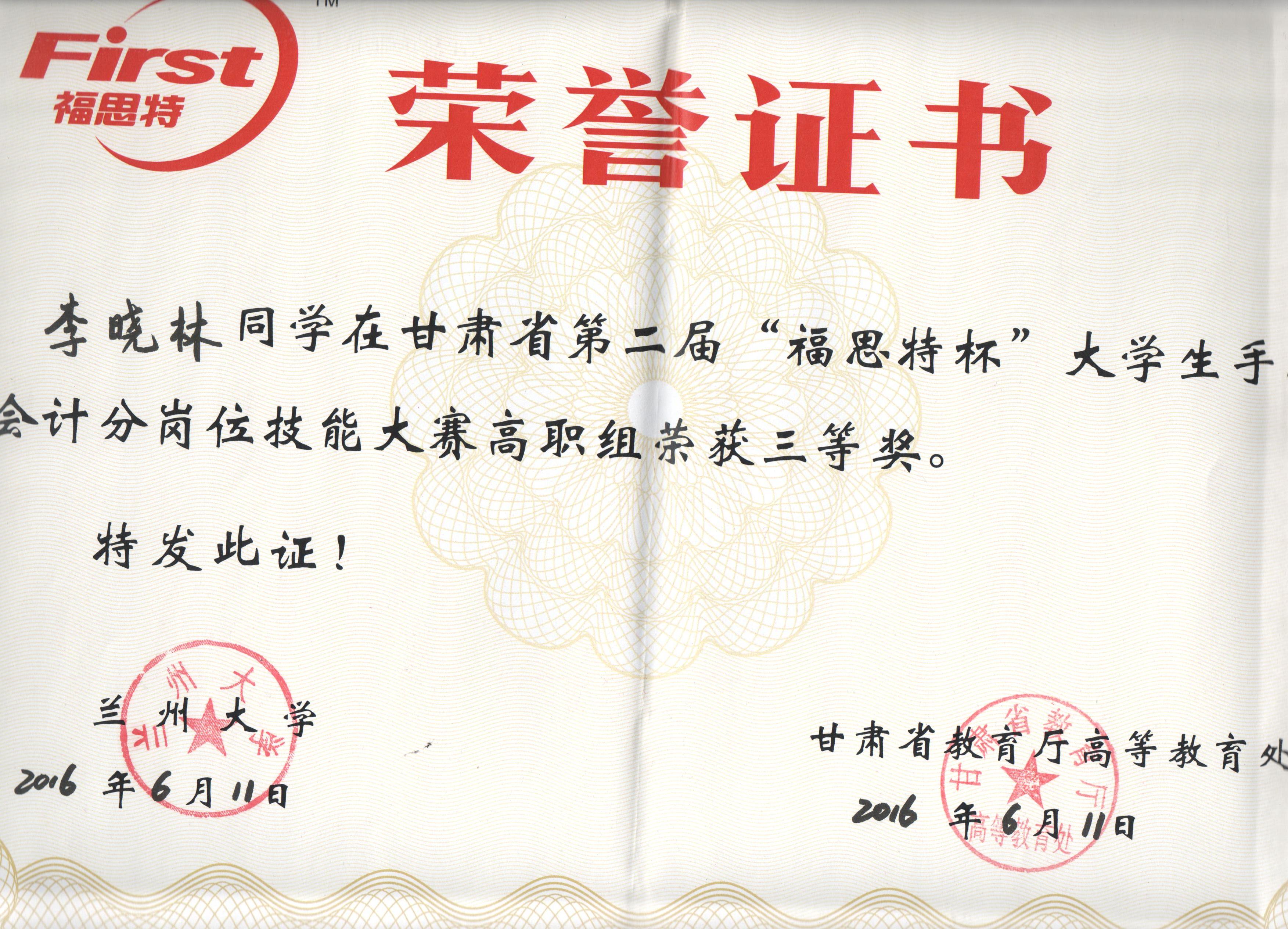 經(jīng)濟(jì)管理系李惠蘭老師指導(dǎo)我系會(huì)計(jì)專(zhuān)業(yè)學(xué)生參加甘肅省第二屆“福思特”大學(xué)生手工會(huì)計(jì)分崗位技能競(jìng)賽,榮獲高職組三等獎(jiǎng)。