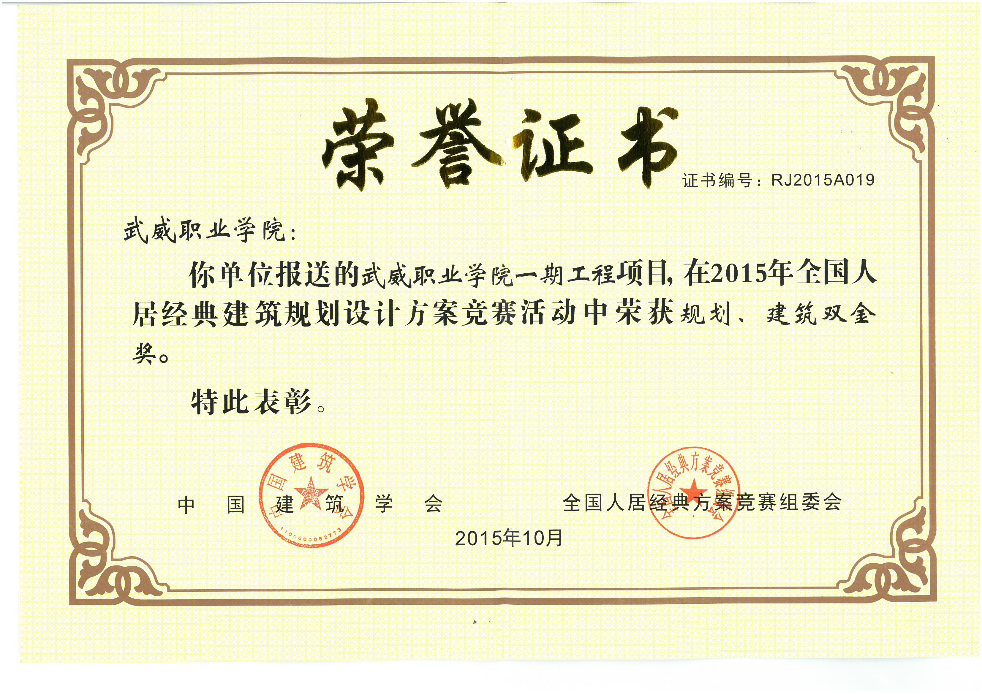 2015年10月,第十五屆全國人居經典建筑規(guī)劃設計方案競賽結果在北京揭曉,我院報送的武威職業(yè)學院一期擴建項目在全國眾多參賽項目中脫穎而出,榮膺規(guī)劃、建筑雙金獎。全國人居經典方案競賽由中國建筑學會主辦,全國人居經典方案競賽組委會承辦,自2001年起每年舉辦一屆,參賽項目覆蓋全國所有省份及港澳臺地區(qū),評審專家皆為業(yè)界權威,獲獎難度大,權威性高。榮膺規(guī)劃、建筑雙金獎是武威建筑項目上的首次。