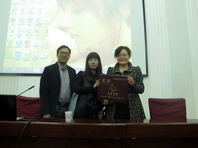 演講結(jié)束后,農(nóng)業(yè)經(jīng)濟系主任晏素珍、黨總支負責人蔡飛向殷繡嬌女士贈送了中國旅游標志銅奔馬模型。