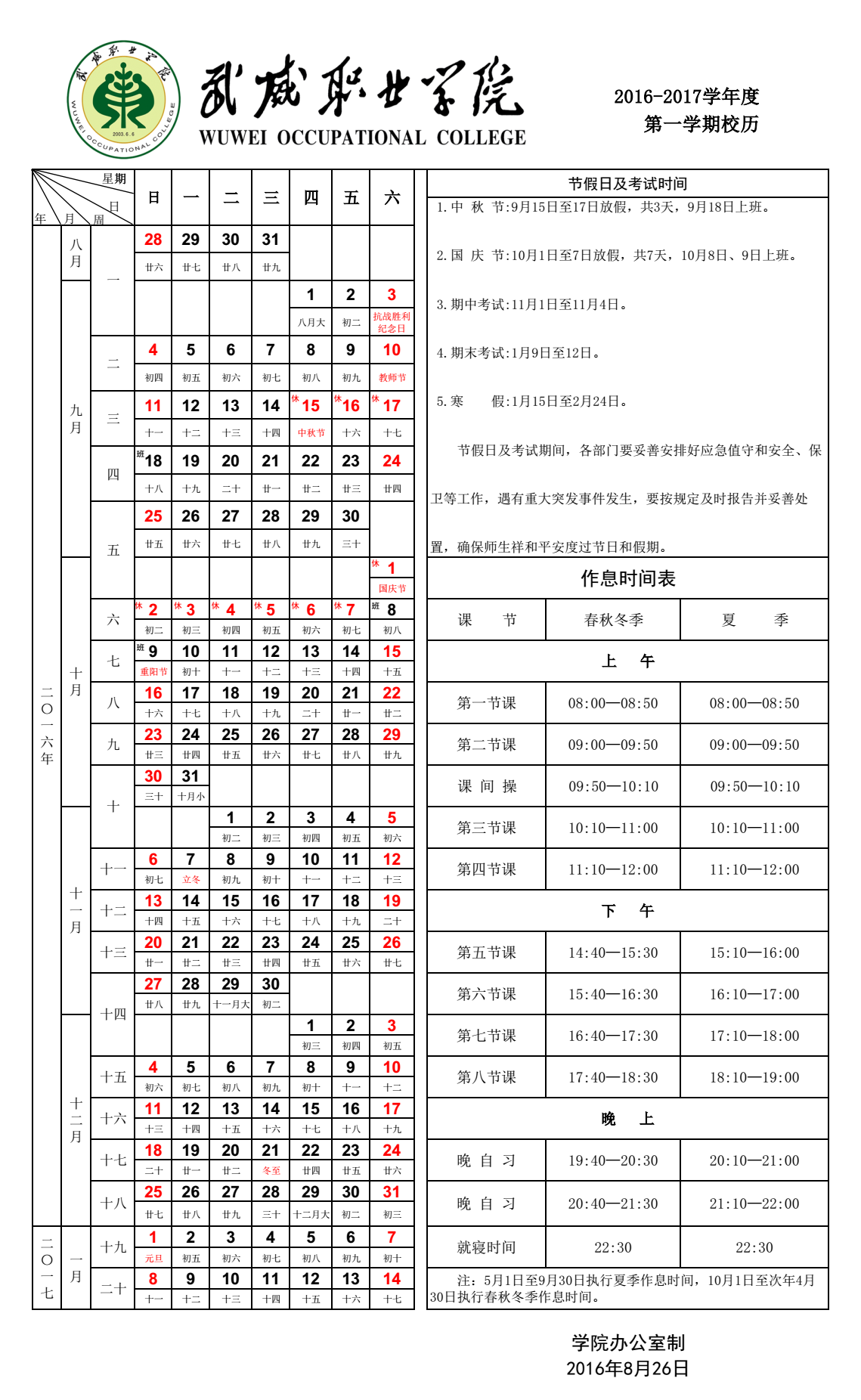 2016-2017學年度 第一學期校歷