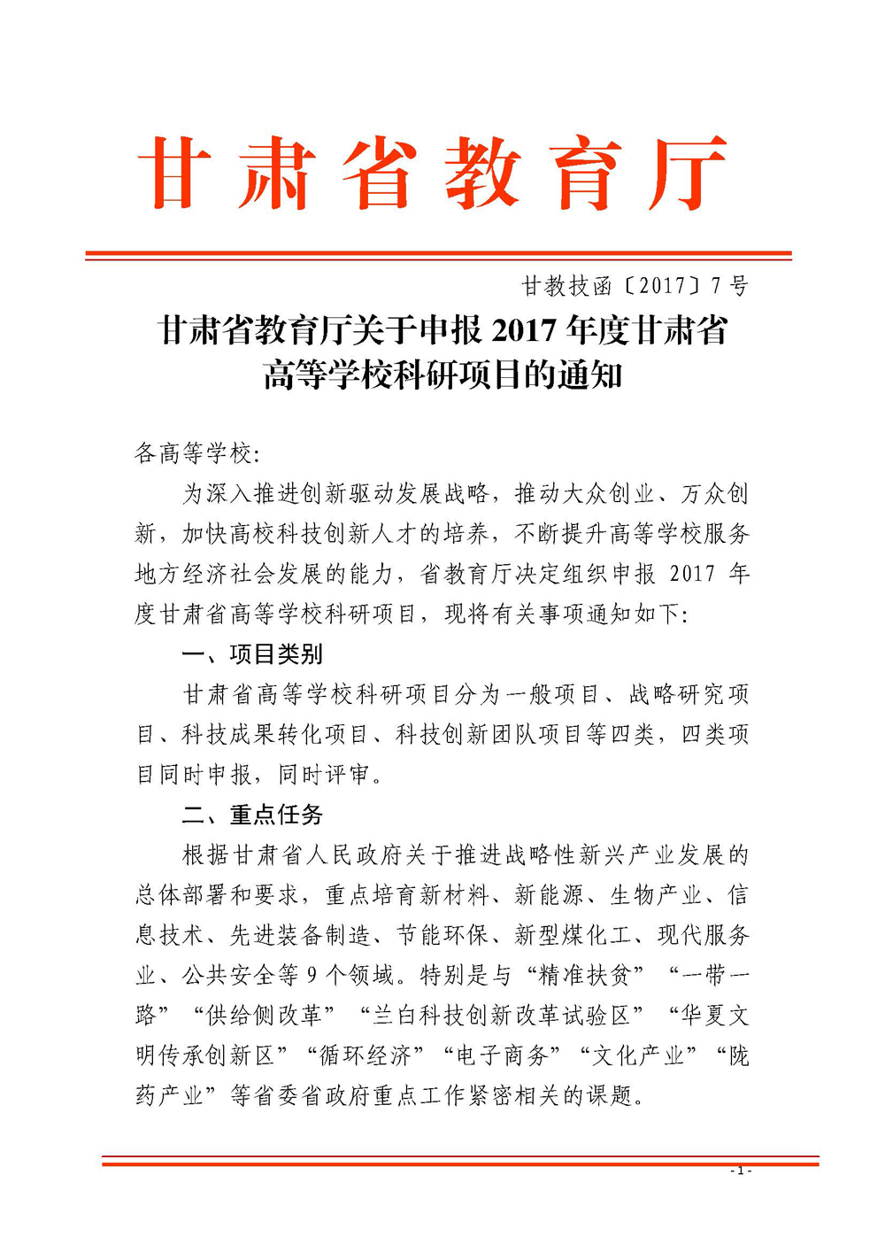 甘肅省教育廳關(guān)于申報2017年度甘肅省高等學(xué)??蒲许?xiàng)目的通知