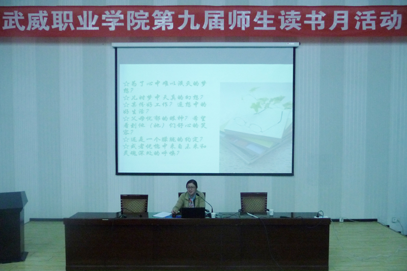 為在全院師生中營(yíng)造良好的讀書(shū)氛圍,豐富校園文化生活,在第22個(gè)世界讀書(shū)日來(lái)臨之際,4月20日,武威職業(yè)學(xué)院第九屆讀書(shū)月活動(dòng)專題講座在正德廳舉行。學(xué)院中文專業(yè)副教授、電子信息工程系主任李亞梅應(yīng)邀進(jìn)行了《為何而讀書(shū)》的專題講座,近300名師生參加了此次講座。