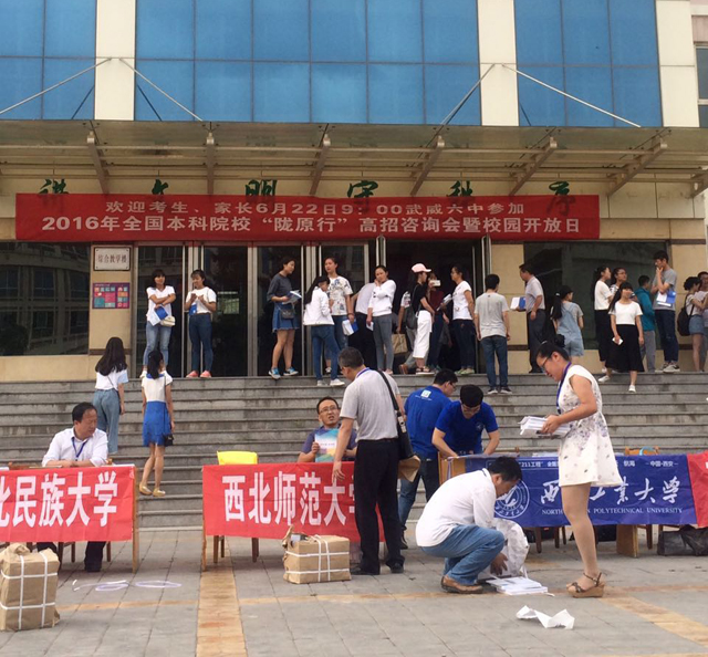 同一天,招生就業(yè)處還選派老師參加了在武威六中舉行的由《未來導(dǎo)報(bào)》主辦的“2016年全國本科院?!]原行’高招咨詢會(huì)”,就考生和家長(zhǎng)關(guān)心的相關(guān)熱點(diǎn)問題進(jìn)行了現(xiàn)場(chǎng)答疑解惑,考生及家長(zhǎng)表示對(duì)他們掌握各院校熱門專業(yè)和報(bào)考要求有很大幫助。