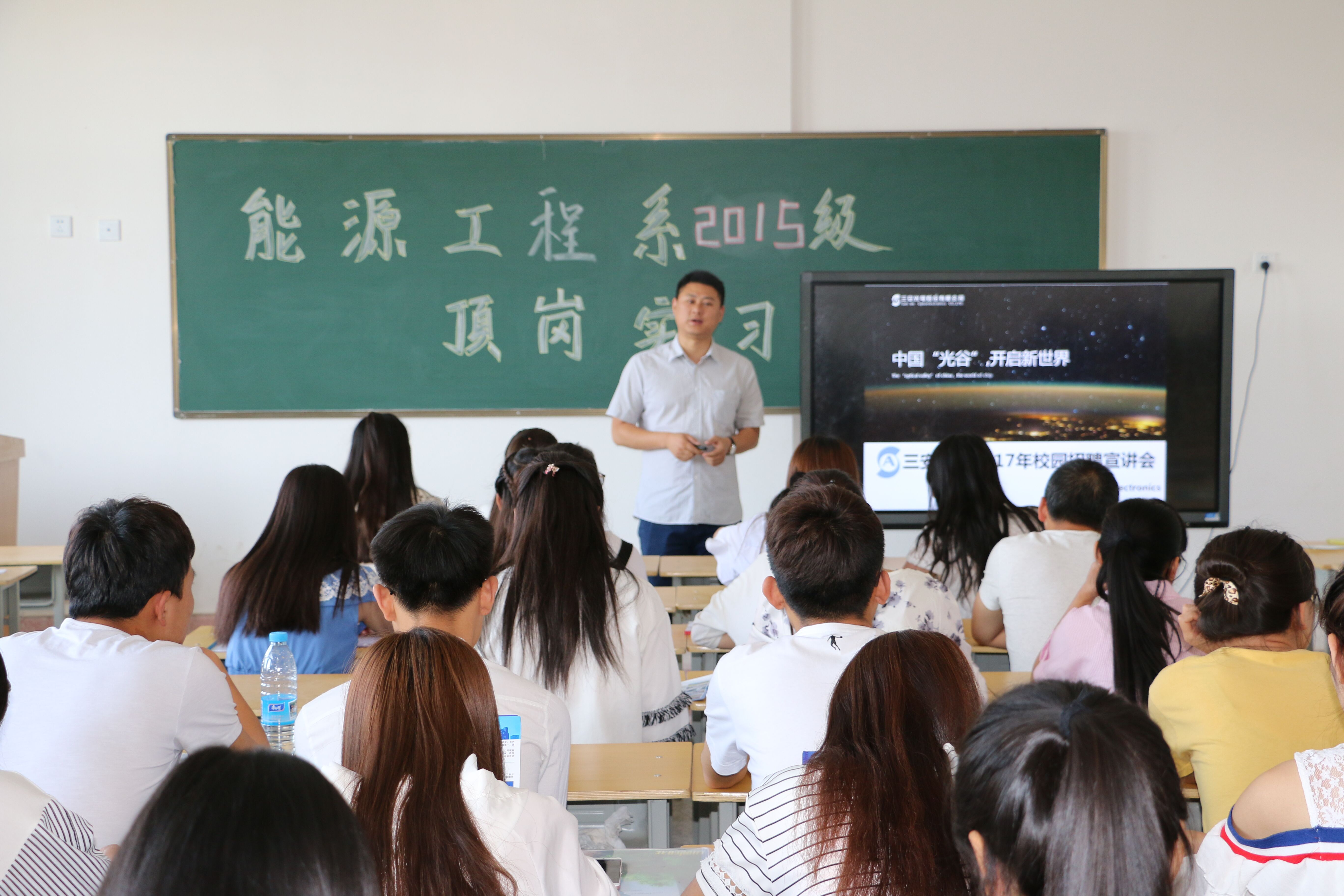 為進一步深化校企合作,提供更優(yōu)質的頂崗實習崗位,6月26日早上,能源工程系邀請校企合作企業(yè)安徽三安光電有限公司和晶科能源有限公司工作人員在我系洽談校企合作事宜,并對即將進入實習的2015級學生做頂崗實習宣講。