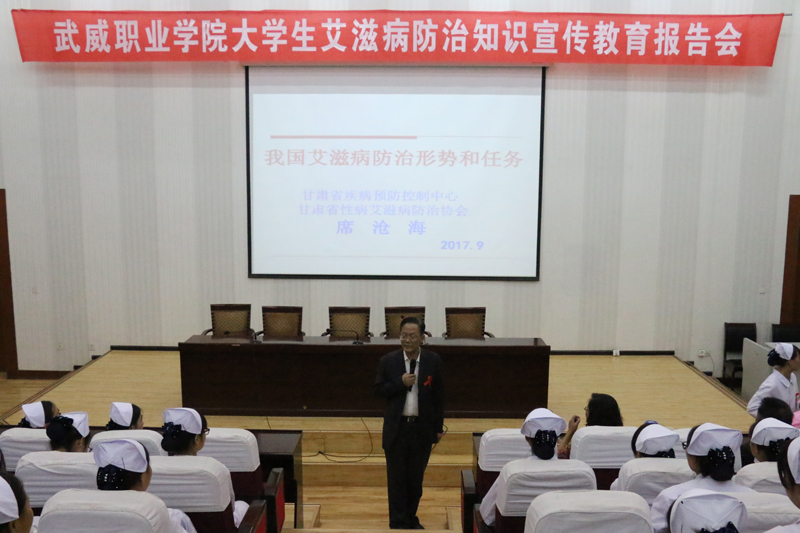 9月21日晚,甘肅省性病艾滋病防治協(xié)會(huì)副會(huì)長(zhǎng)、甘肅省艾滋病首席專家、主任醫(yī)師席倉海教授在學(xué)院正德廳為我院學(xué)生作了一場(chǎng)“大學(xué)生艾滋病防治知識(shí)宣傳教育”講座,講座由市疾控中心主任楊天琳主持,學(xué)院護(hù)理系黨總支書記張建輝、市疾控中心性病艾滋病科科長(zhǎng)王永瑚、市中心血站血源科科長(zhǎng)邢志勇及學(xué)院各級(jí)團(tuán)干部和紅絲帶協(xié)會(huì)共280多人聆聽了講座。