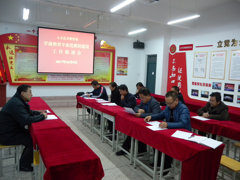 為了進一步推進學院優(yōu)質高職院校建設,人文藝術教育系于10月9日下午在勵勤樓209會議室召開了學前教育專業(yè)優(yōu)質校建設推進會。會議由系黨總支書記胡靜峰主持,人文藝術教育系學前教育專業(yè)建設項目組全體成員參加。