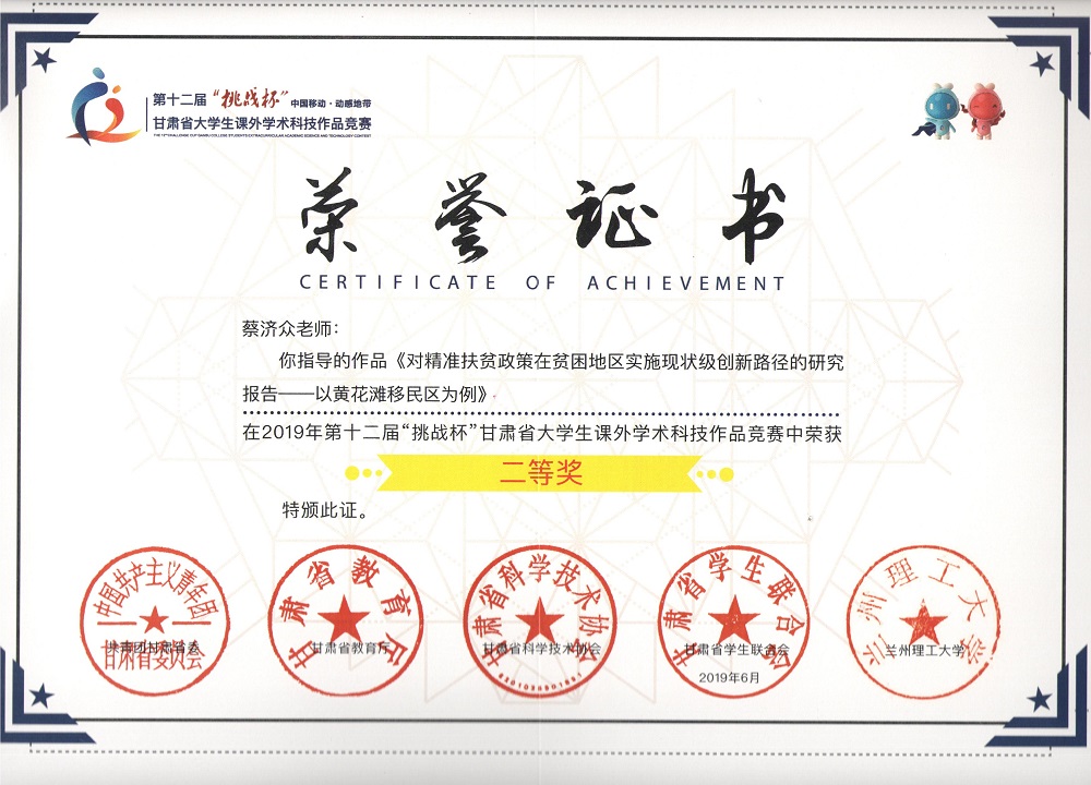 第十二屆“挑戰(zhàn)杯”甘肅省大學(xué)生課外學(xué)術(shù)科學(xué)作品《對精準(zhǔn)扶貧政策在貧困地區(qū)實施現(xiàn)狀級創(chuàng)新路徑的研究報告-以黃花灘移民為例》