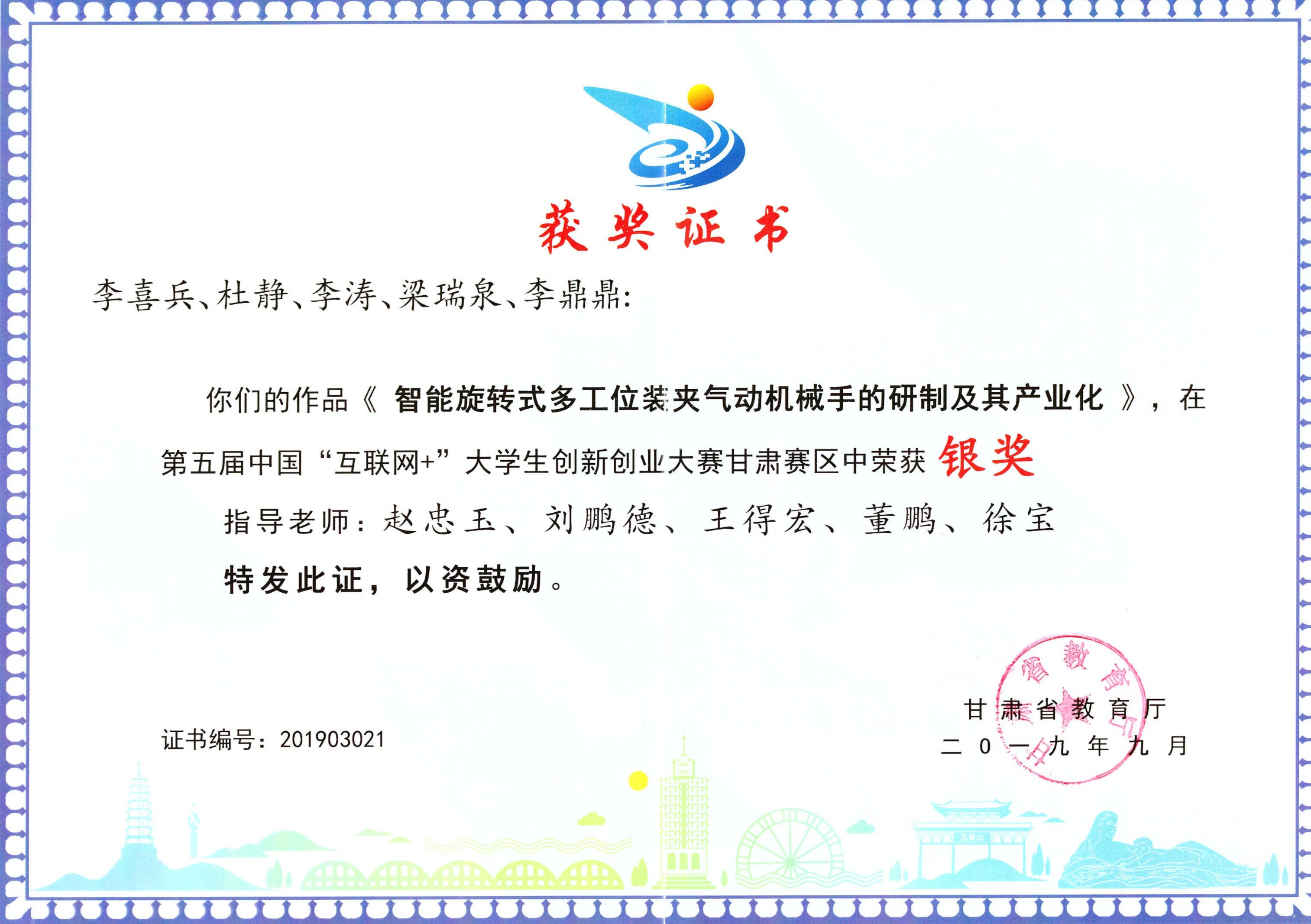 .第五屆中國“互聯(lián)網(wǎng)+”大學(xué)生創(chuàng)新創(chuàng)業(yè)大賽甘肅賽區(qū)《智能旋轉(zhuǎn)式多工位裝夾氣動機(jī)械手的研制及其產(chǎn)業(yè)化》
