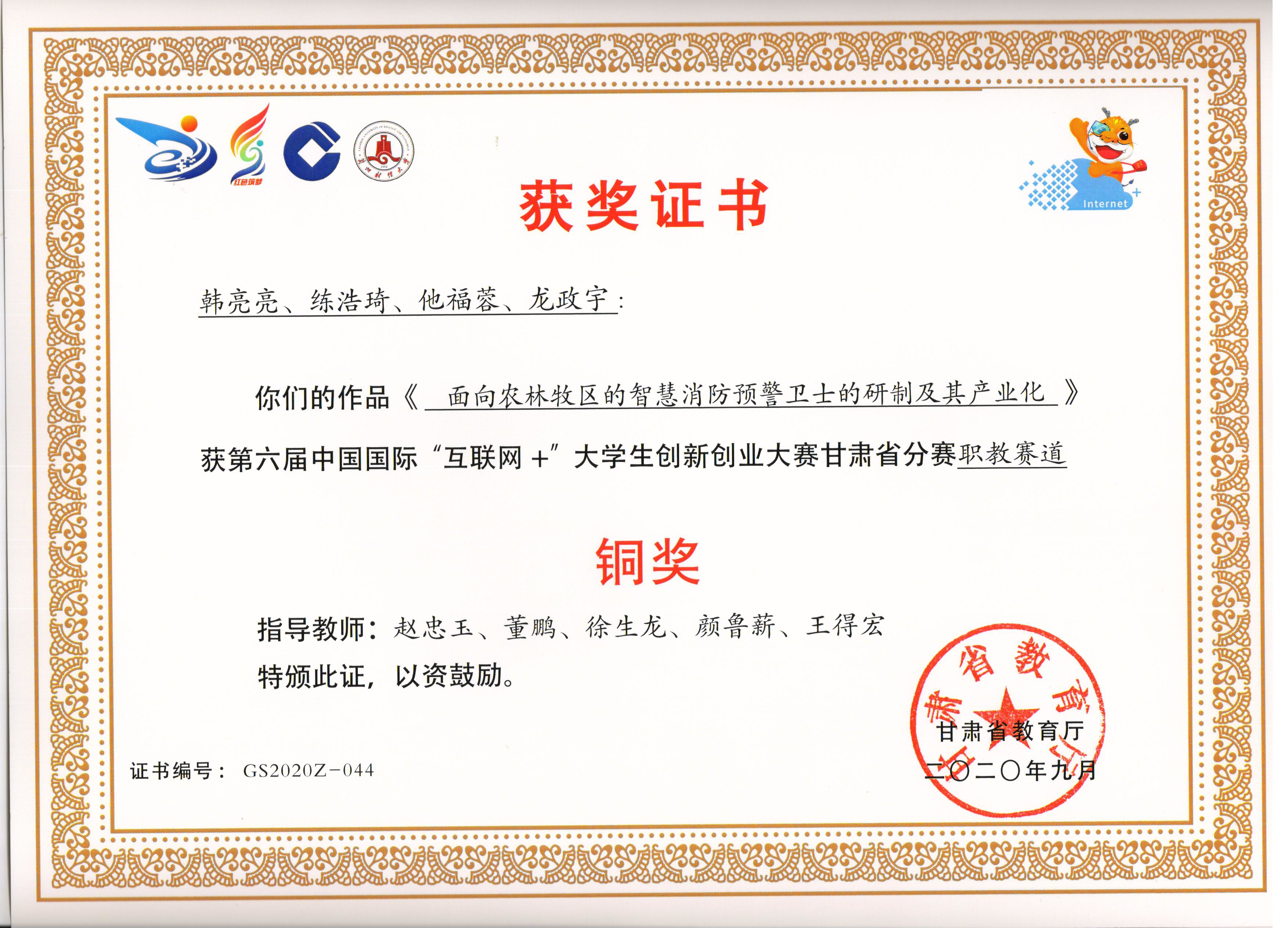 第六屆中國國際“互聯(lián)網(wǎng)+”大學(xué)生創(chuàng)新創(chuàng)業(yè)大賽甘肅省分賽職教賽道《面向農(nóng)林牧區(qū)的智慧消防預(yù)警衛(wèi)士的研制及其產(chǎn)業(yè)化》