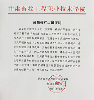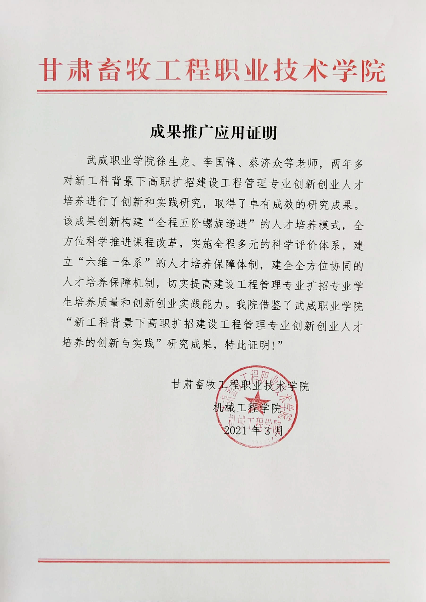 成果推廣應用證明(甘肅畜牧工程職業(yè)技術(shù)學院)