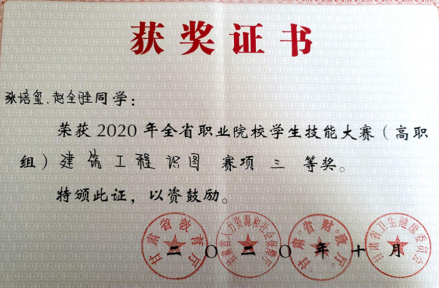 2020年全省職業(yè)院校學(xué)生技能大賽(高職組)建筑工程識(shí)圖賽項(xiàng)獲三等獎(jiǎng)