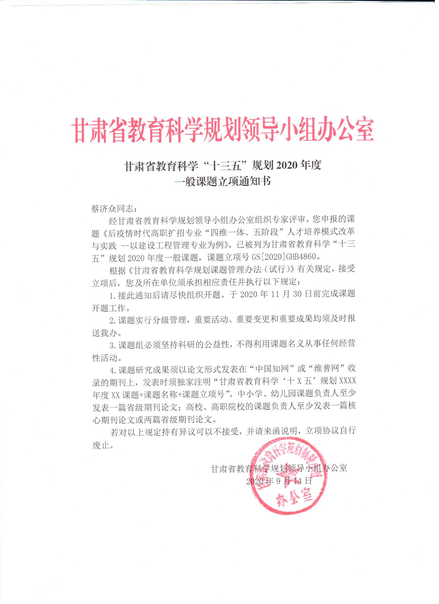 1.2020年項目組成員蔡濟眾、康興奎申報甘肅省“十三五”教育規(guī)劃課題《后疫情時代高職擴招專業(yè)“四維一體、五階段”人才培養(yǎng)改革與實踐-以建設工程管理專業(yè)為例》 立項 【立項通知書】