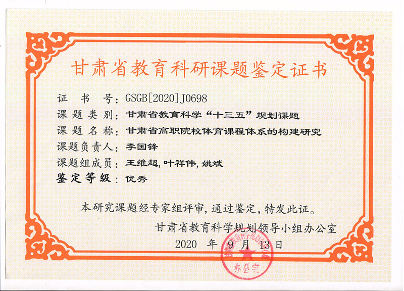 6.2020年項目組成員李國鋒完成甘肅省教育科學“十三五”規(guī)劃課題《甘肅省高職院校體育課程體系的構(gòu)建研究》已結(jié)項獲優(yōu)秀獎 【鑒定證書】