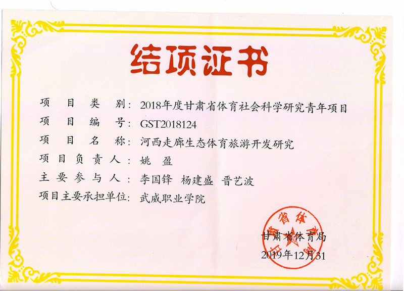 8.2019年項目組成員李國鋒參與完成甘肅省體育社會科學研究青年項目《河西走廊生態(tài)體育旅游開發(fā)研究》已結(jié)項 【結(jié)項證書】