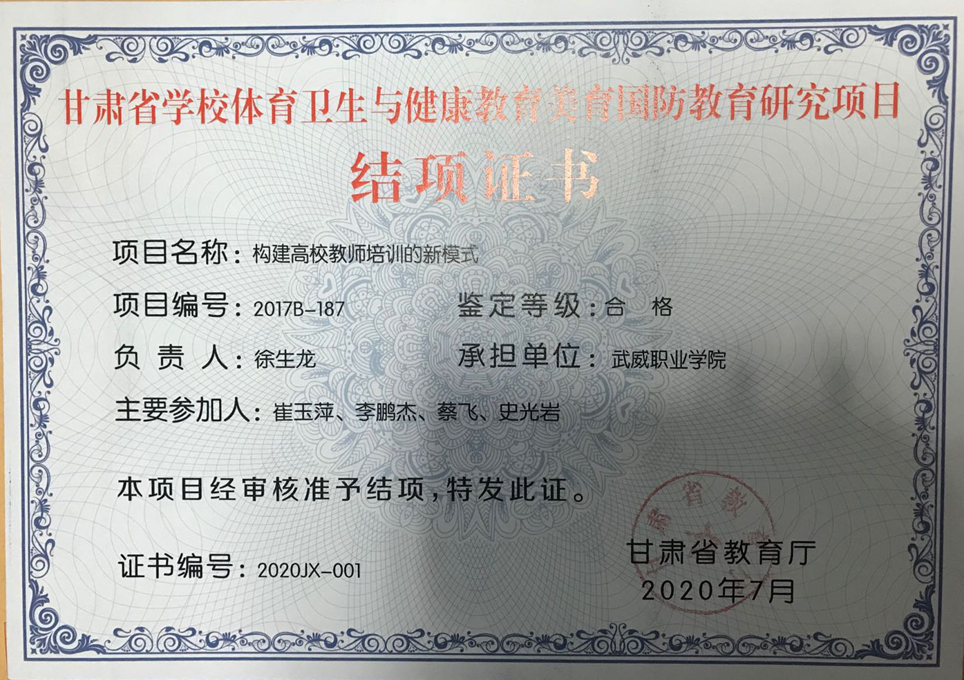 9.2020年項目組成員徐生龍主持完成甘肅省學校體育衛(wèi)生與健康教育美育國防教育研究項目《構(gòu)建高校教師培訓的新模式》 結(jié)項 【結(jié)項證書】