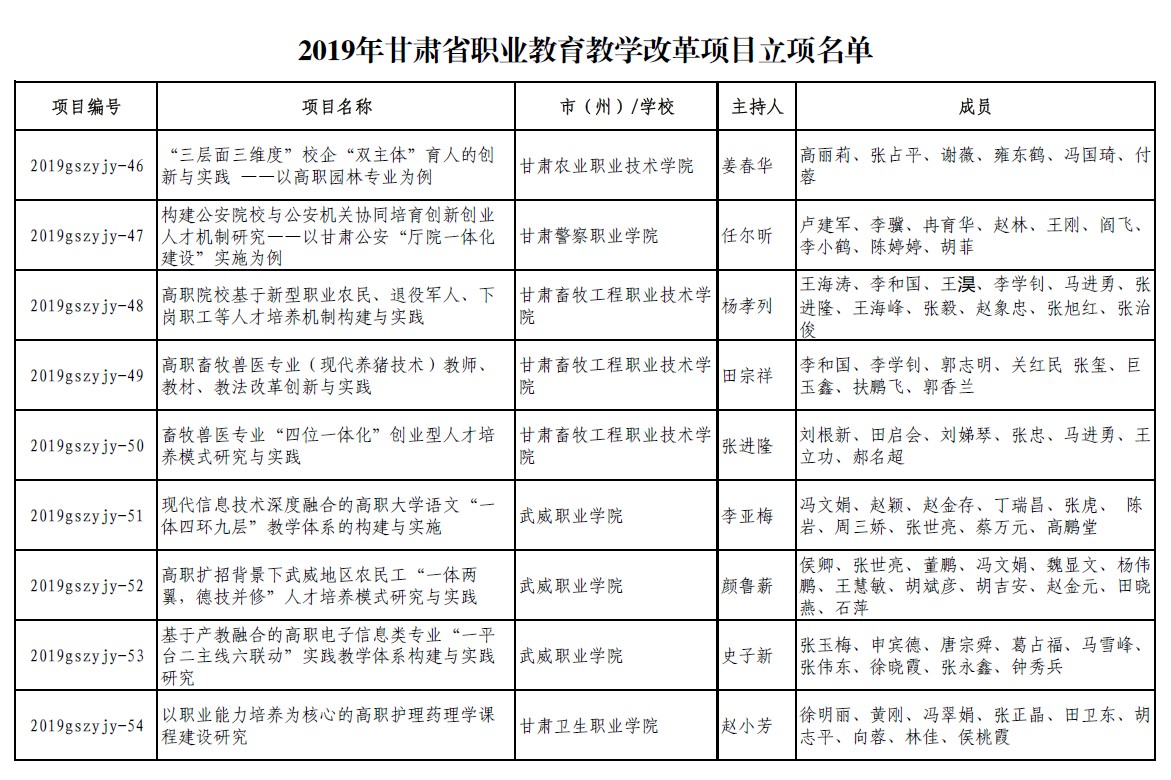 11.2019年項目組成員董鵬參加職業(yè)教育改革研究項目《高職擴招背景下武威地區(qū)農(nóng)民工“一體兩翼,德技并修”人才培養(yǎng)模式研究與實踐》結(jié)項【立項通知】 【立項名單】