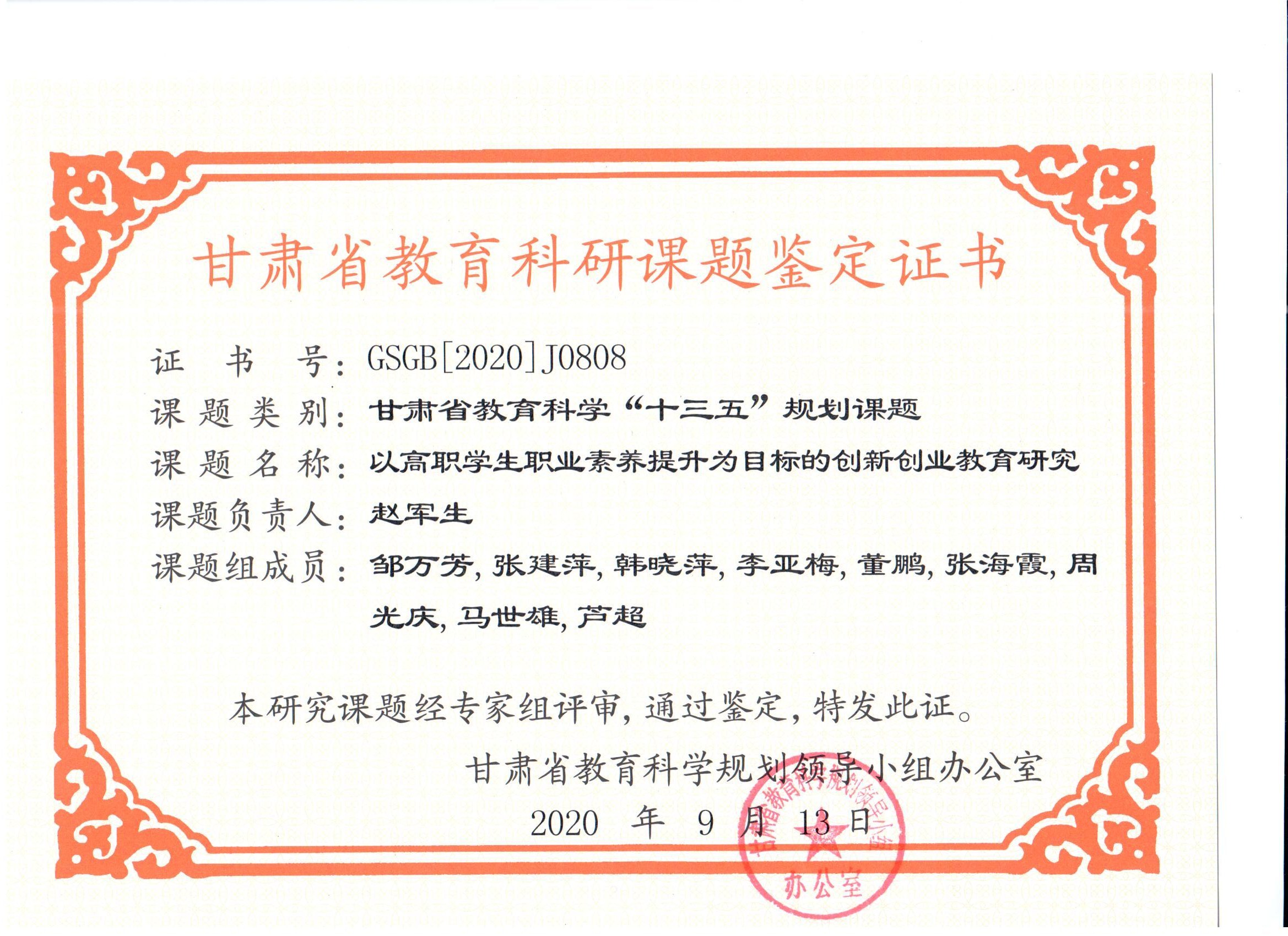 13.2020年項目組成員董鵬完成甘肅省教育科學“十三五”規(guī)劃課題《以高職學生職業(yè)素養(yǎng)提升為目標的創(chuàng)新創(chuàng)業(yè)教育研究》 結(jié)項 【鑒定證書】