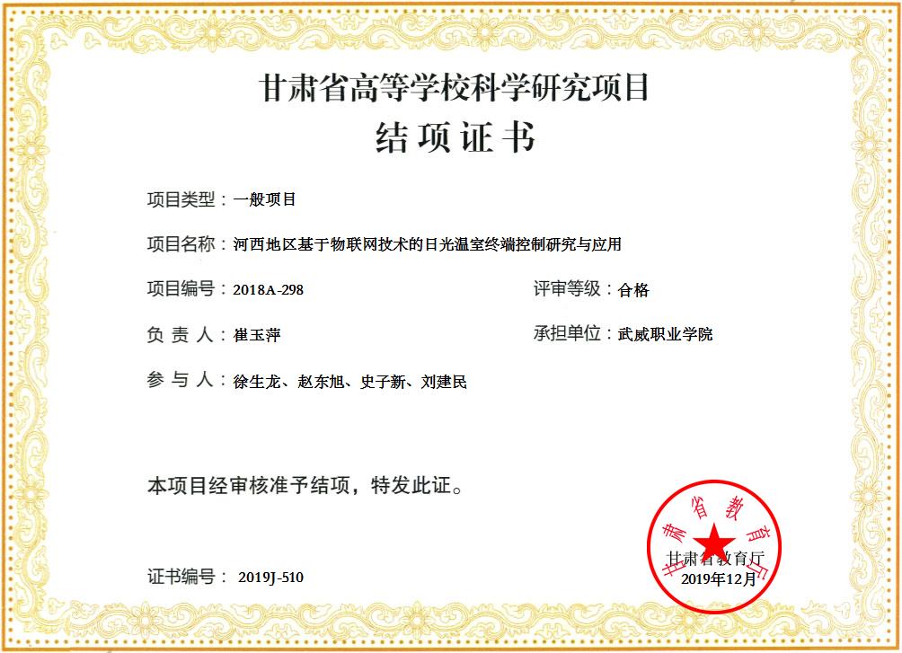 19.2019年項目組成員崔玉萍主持完成甘肅省高等學??茖W研究項目《河西地區(qū)基于物聯(lián)網(wǎng)技術(shù)的日光溫室終端控制研究與應用》 結(jié)項 【結(jié)項證書】