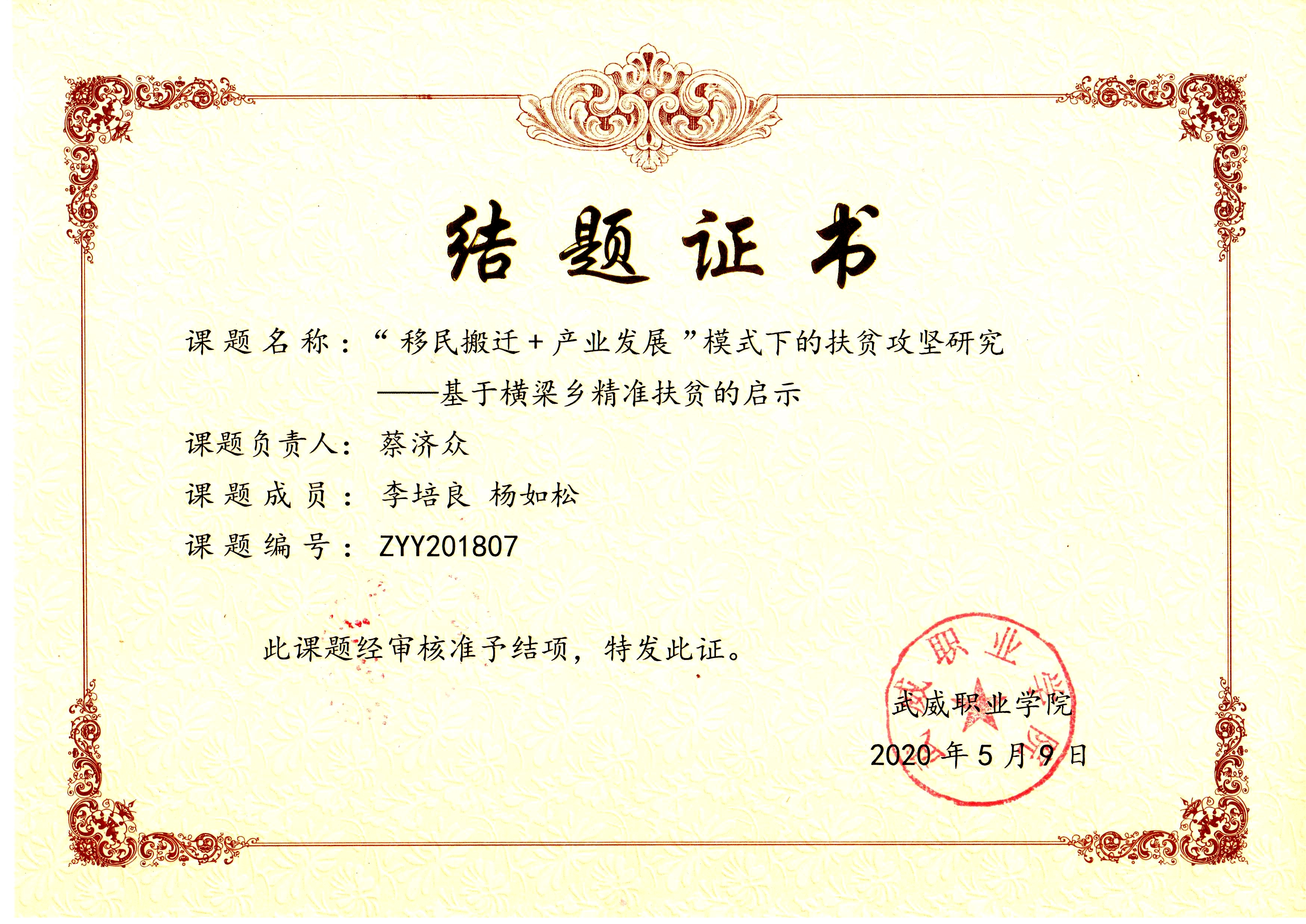 25.2020年項目組成員蔡濟眾主持完成院級科研項目《“移民搬遷+產(chǎn)業(yè)發(fā)展”模式下的扶貧攻堅研究--基于橫梁鄉(xiāng)精準扶貧的啟示》 結(jié)項 【結(jié)題證書】