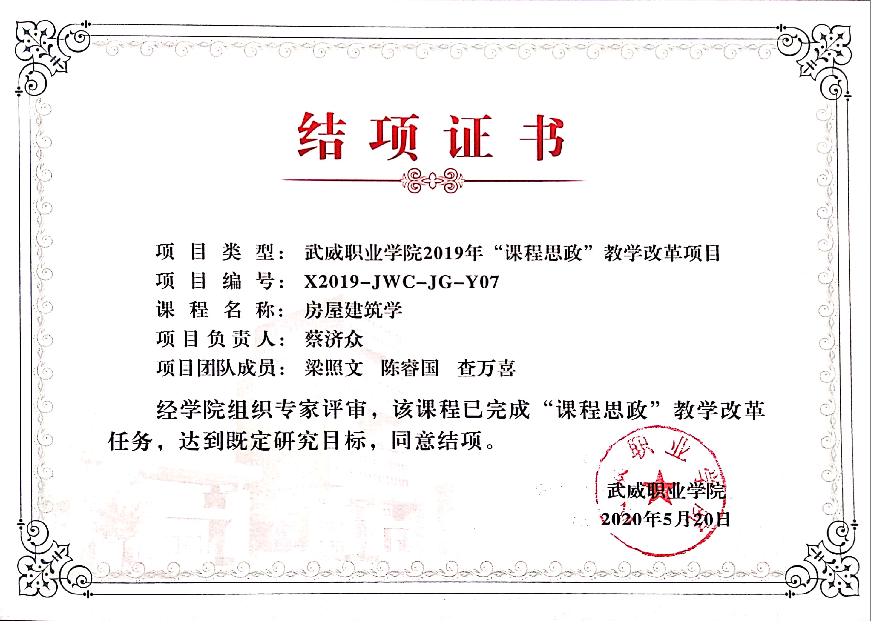 26.2020年項目組成員蔡濟眾、陳睿國主持完成《房屋建筑學》課程思政改革? 結(jié)項 【結(jié)項證書】